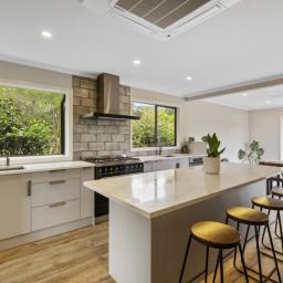 Step inside to a light-filled, open-plan living, kitchen, and dining area, the heart of the home. In winter, it’s the perfect spot to hunker down for cosy nights; in summer, open the large doors to the expansive deck and lush backyard for easy entertaining. The elevated position offers privacy and tranquillity, with mature trees and the neighbouring reserve creating a park-like setting.