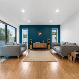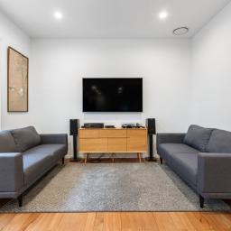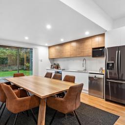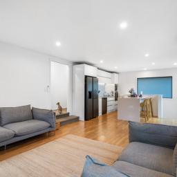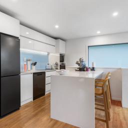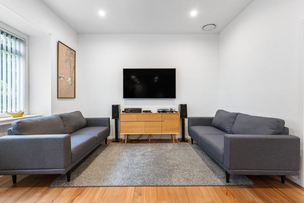 Main living area The heart of the home is the open-plan kitchen, dining and living area. The contemporary kitchen includes a double-door fridge/freezer, dishwasher, below-bench oven and ample storage. The living space features a wall-mounted Phillips 65-inch TV, with a generous dining area flowing seamlessly through the open-plan layout.