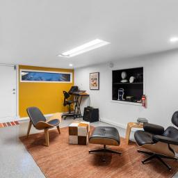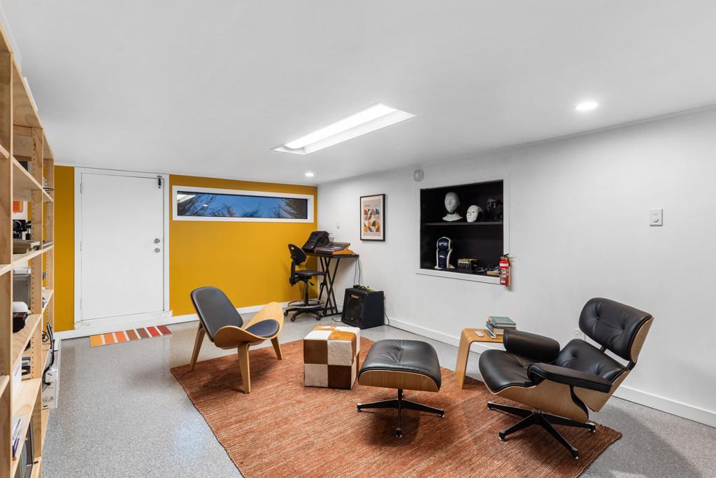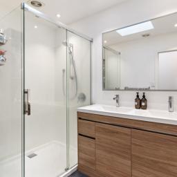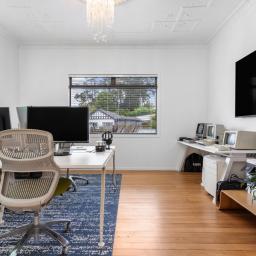 Bedrooms and bathrooms Three main bedrooms are serviced by a full family bathroom with stone tile flooring, double vanity, large shower, skylight and separate WC. The primary bedroom boasts original ceilings and high studs for a wonderful sense of space. A flexible room can be utilised as a gym, bedroom or study.