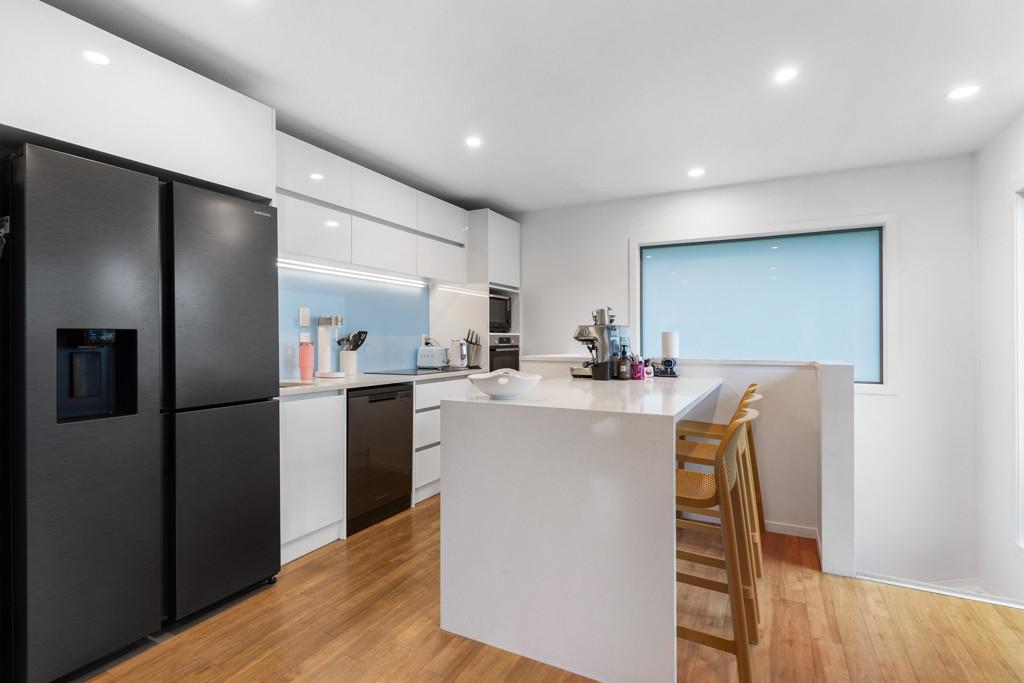 Self-contained area At the front of the house is a self-contained space with its own kitchen featuring a double fridge with chilled water and crushed ice, stainless steel appliances including an above-bench oven and dishwasher, island benchtop and informal dining area. This extends to a deck that spans the southern end of the home, with privacy screens on the doors.