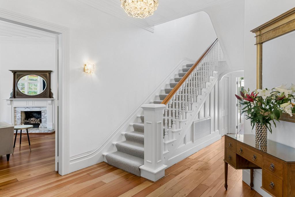 History is deeply felt here. Believed to have been built around 1900 as a summer house for a merchant, the home was the first in the area. A 1909 photograph shows it standing alone in farmland, later occupied by Edwardian residents captured on the same front steps that generations of Aucklanders have since used for portraits. The grand foyer and staircase were designed to make an entrance, and toddlers have tested their courage on those steps for decades.