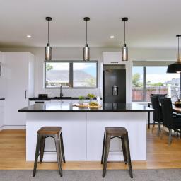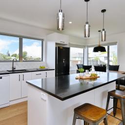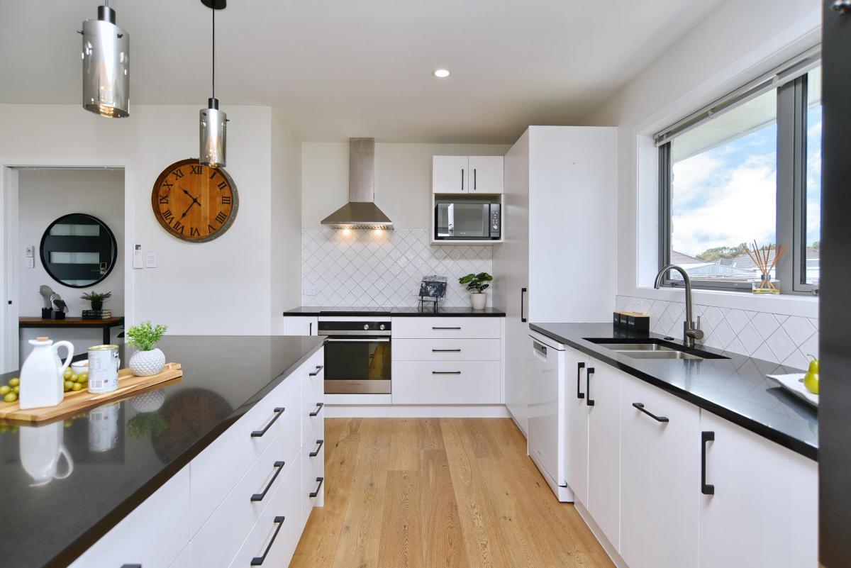The stylish new kitchen with island bench, engineered stone benchtops, and modern appliances flows seamlessly into the open-plan living and dining area, the heart of the home. Cosy fireplace, heat pump, HRV system, and double glazing keep the space warm and comfortable.