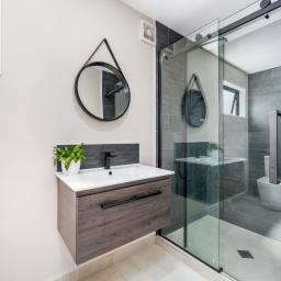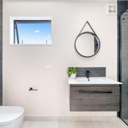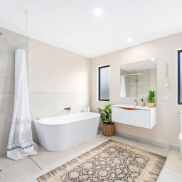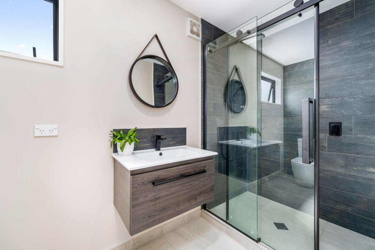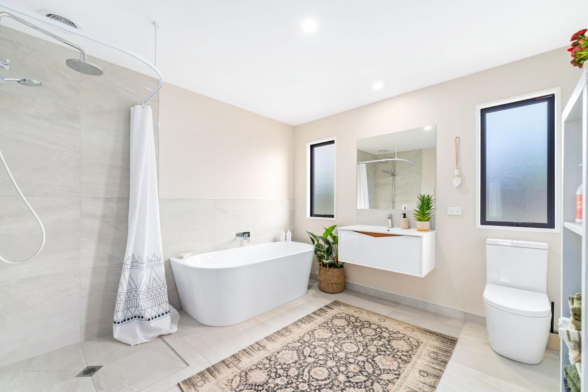 A modern bathroom and an ensuite complement two well-proportioned bedrooms, all finished in a cohesive contemporary style.