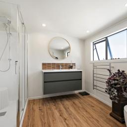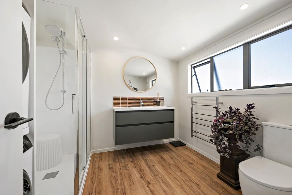 • Stylish, well-appointed bathroom with cleverly integrated laundry
