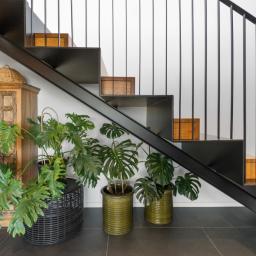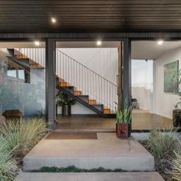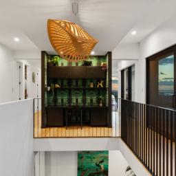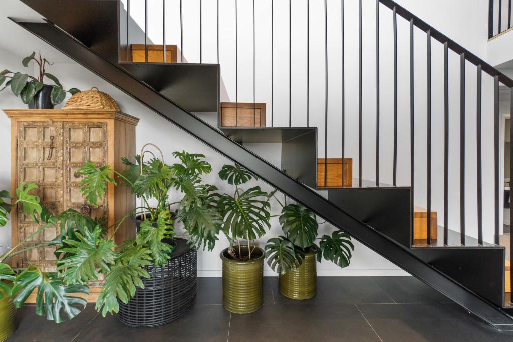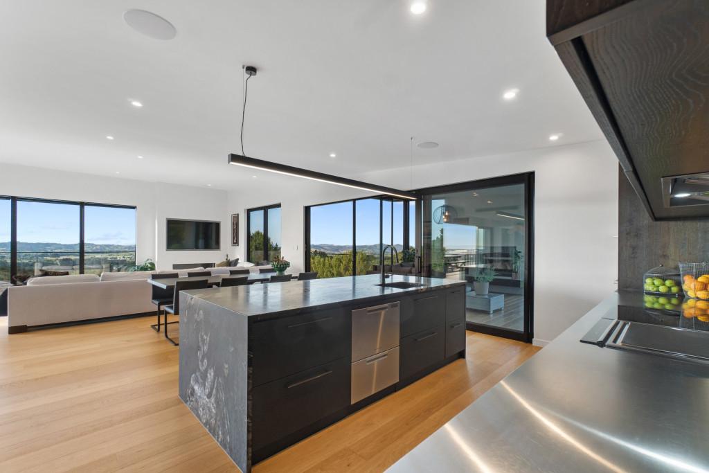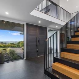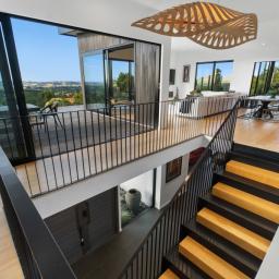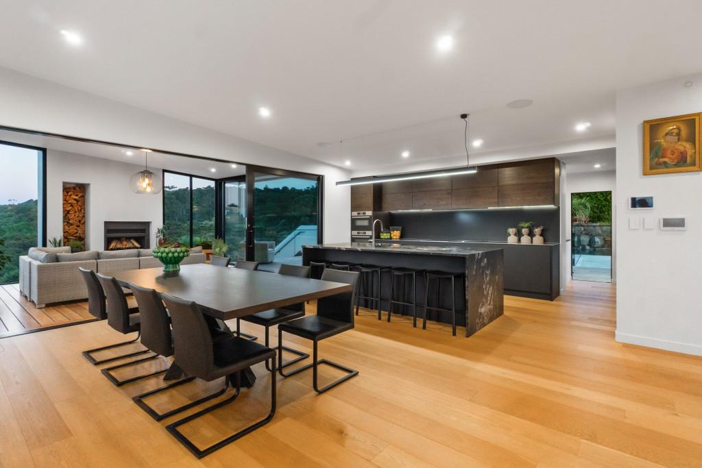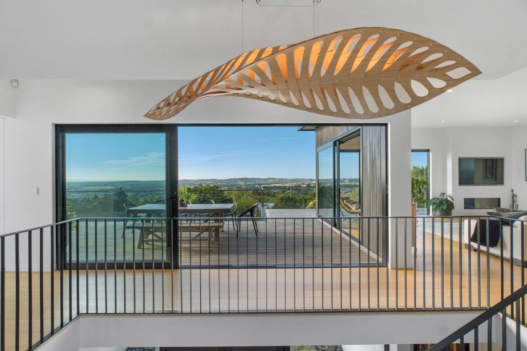 At the centre of the home, a striking black and American oak staircase, illuminated by a David Trubridge "Navicula" pendant, connects the living zones and provides a strong architectural focal point.