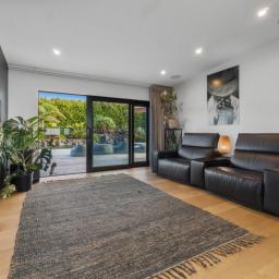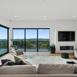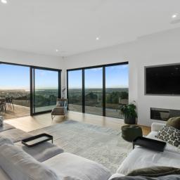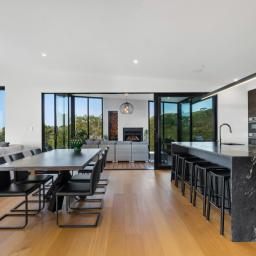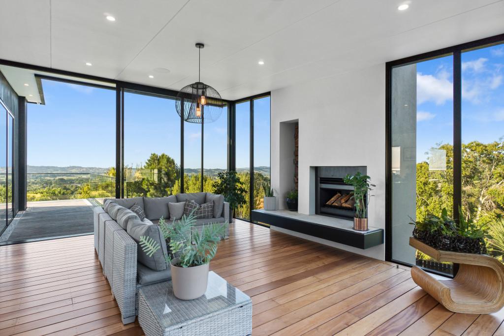Upstairs living is thoughtfully arranged into three distinct zones - a media room, generous main living room and conservatory-style lounge - allowing space for entertaining, quiet retreat or relaxed family living. The main living room is generous and light-filled, with an Escea DS1400 gas fireplace providing warmth, while the conservatory-style lounge features an outdoor Broady's wood fire providing ambience year-round.