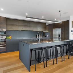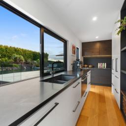 The designer kitchen is purpose-built for entertaining, featuring Titanium Gold honed granite benchtops, KitchenTech cabinetry in rustic oak with dark stain and satin finish, premium Bosch appliances, an AEG teppanyaki plate, Fisher & Paykel double DishDrawer plus extra-wide platter dishwasher, and an InSinkErator boiling / cold / hot water tap. A concealed scullery-style prep kitchen with pool outlook allows seamless hosting without compromise.