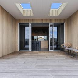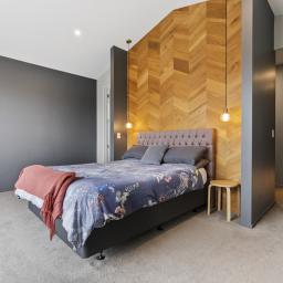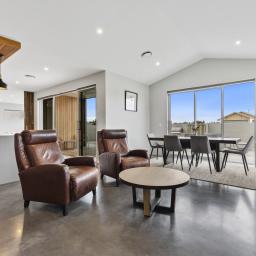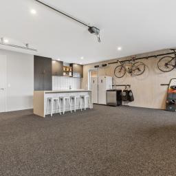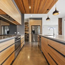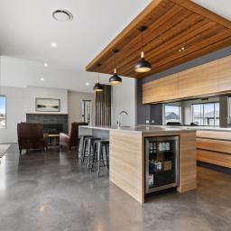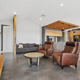 At the heart of the home, the open-plan kitchen, dining, and sitting area is both striking and functional, featuring polished concrete floors, high ceilings, and oversized doors that enhance the sense of space and light. Beautiful timber features are carried throughout the home, adding warmth and character, while a second lounge provides a separate retreat for relaxed living or entertaining.