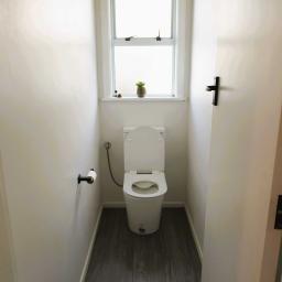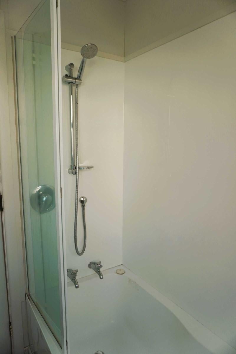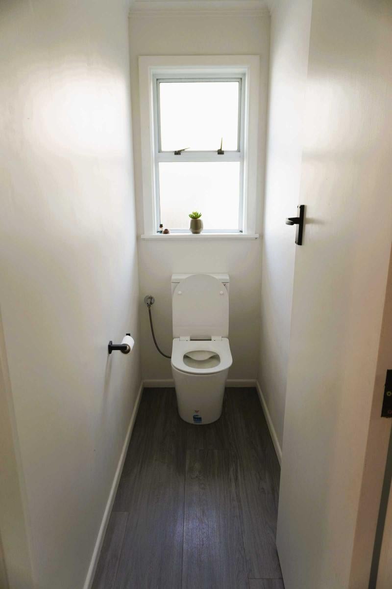 Separate bathroom and toilet with shower over bath.