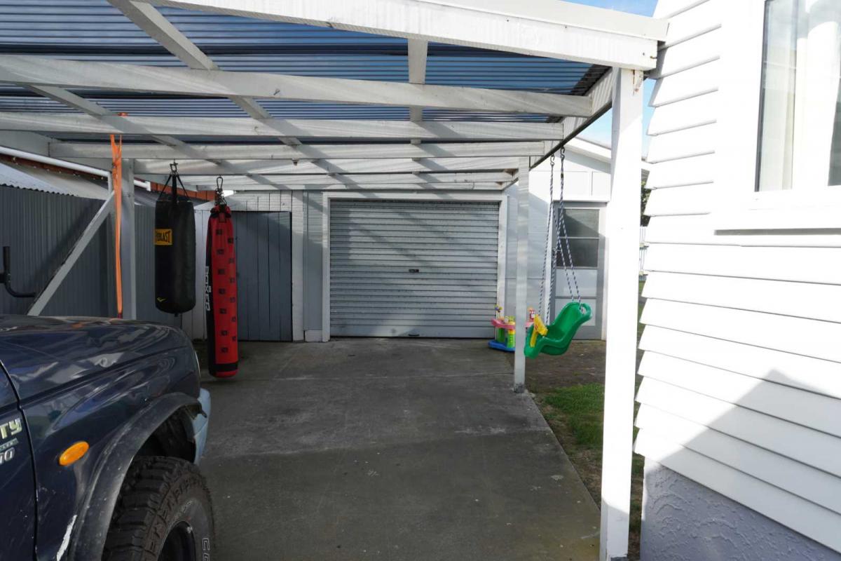 Decent single garage with studio/workshop space and separate exterior storage to outside of shed. Plus covered carport.