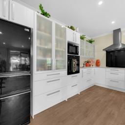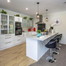 A spacious kitchen with a modern appliances. Wide entertainers island stone bench. The combined dining area creates a warm and inviting space for family meals, while to the left is a family/sitting comfortable area.