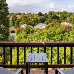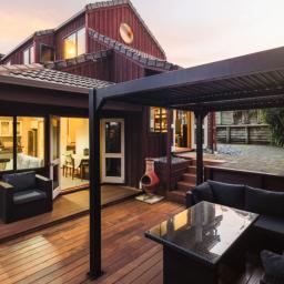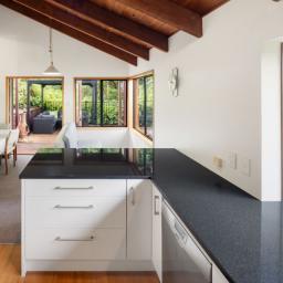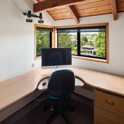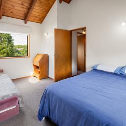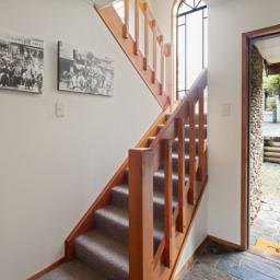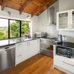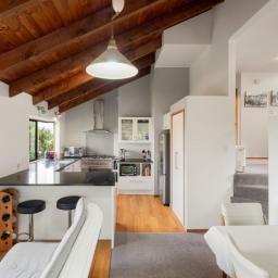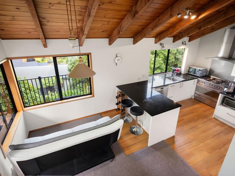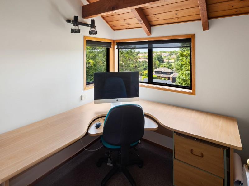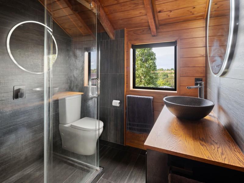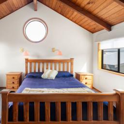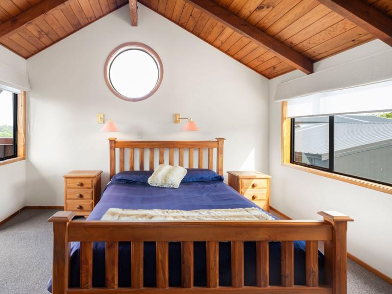 Accommodation is thoughtfully arranged across two levels, with three bedrooms plus an office and two bathrooms. The upstairs master suite enjoys its own deck with an elevated outlook, a walk-in wardrobe and a tiled ensuite with underfloor heating which was renovated in 2019, while the additional bedrooms are full of charm, including distinctive round windows and pitched ceilings that enhance the home’s character.