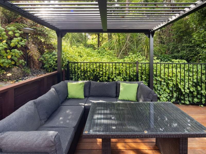 Outdoors, the setting is private and green, with established native planting, lawn space, paved areas, a manual louvre system and multiple deck zones for entertaining or relaxing. The oversized internal-access garage provides space for a vehicle plus additional storage, along with good off-street parking.