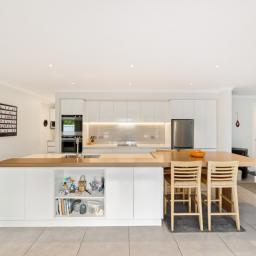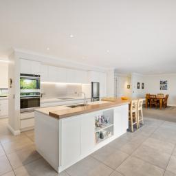 Positioned on a private corner section and surrounded by established trees, the home opens to a stunning open-plan kitchen, dining and living area enhanced by over-height ceilings. The modern kitchen offers stone benchtops, two ovens, two dish drawers, and excellent storage, complemented by a generous walk-in pantry complete with a sink and space for a mini fridge. Living spaces flow effortlessly to a covered deck featuring skylights and a pull-down blind, allowing the area to be enclosed for year-round enjoyment. A separate lounge provides a versatile second living space, while ducted heating across three zones, a wood burner fire and ducted heating in the kitchen and ensuite ensure comfort in every season.