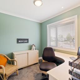 There are four generously sized bedrooms plus a dedicated office. The master suite is a true retreat, featuring outdoor access, a large walk-in robe, a tiled ensuite with a tiled shower and bath. One additional bedroom includes its own tiled ensuite, ideal for guests or extended family. Upstairs, the remaining two bedrooms are both excellent sizes and feature opening skylights with blinds, sharing a well-appointed bathroom.