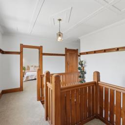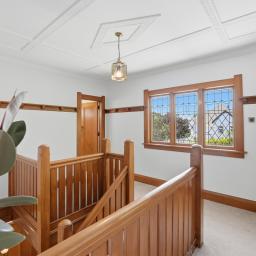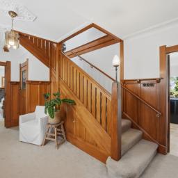 From the moment you arrive, the home's presence is undeniable. A covered portico with stained-glass detailing allows guests to arrive in comfort, rain or shine, before stepping into a truly welcoming entrance hall. Here, rich native timber panelling and a sweeping wooden staircase set the tone for the craftsmanship and charm that unfolds throughout.