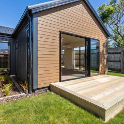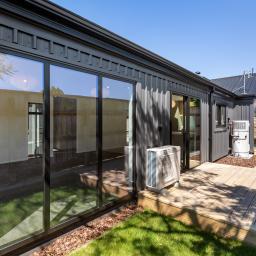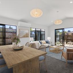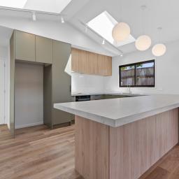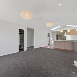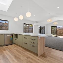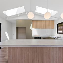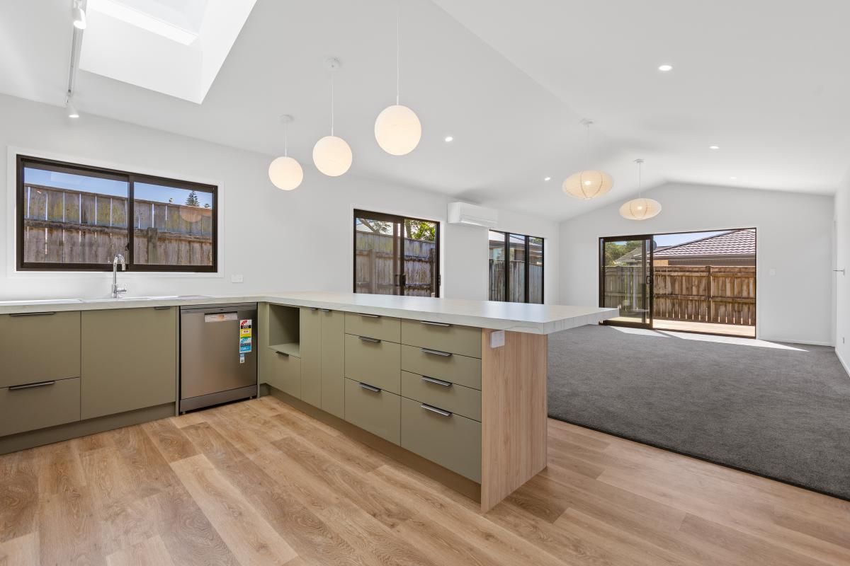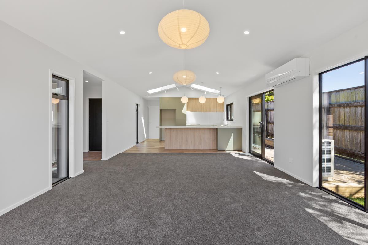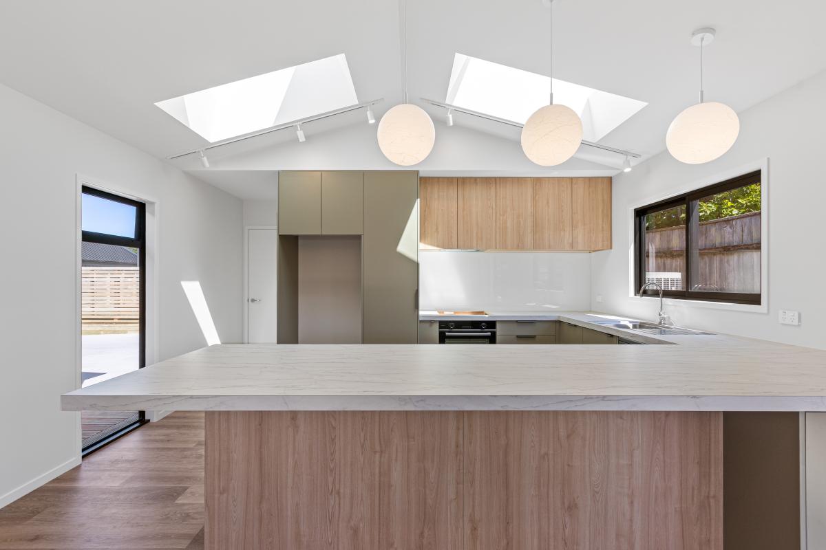 Sun-filled open-plan living forms the heart of the home, where the kitchen, dining, and lounge flow seamlessly to flat outdoor lawn and decking areas, perfect for entertaining friends or unwinding at the end of the day. Skylights introduce additional natural light, enhancing the sense of space, while a soft neutral colour palette creates a calm, timeless backdrop.