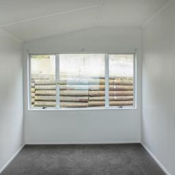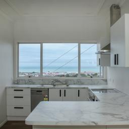 The fully renovated kitchen includes a new benchtop, dishwasher, and induction oven, with a picturesque outlook from the kitchen sink. A wall-mounted heat pump located in the kitchen provides year-round comfort.