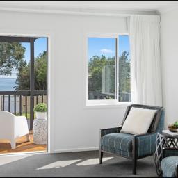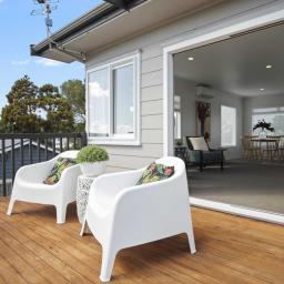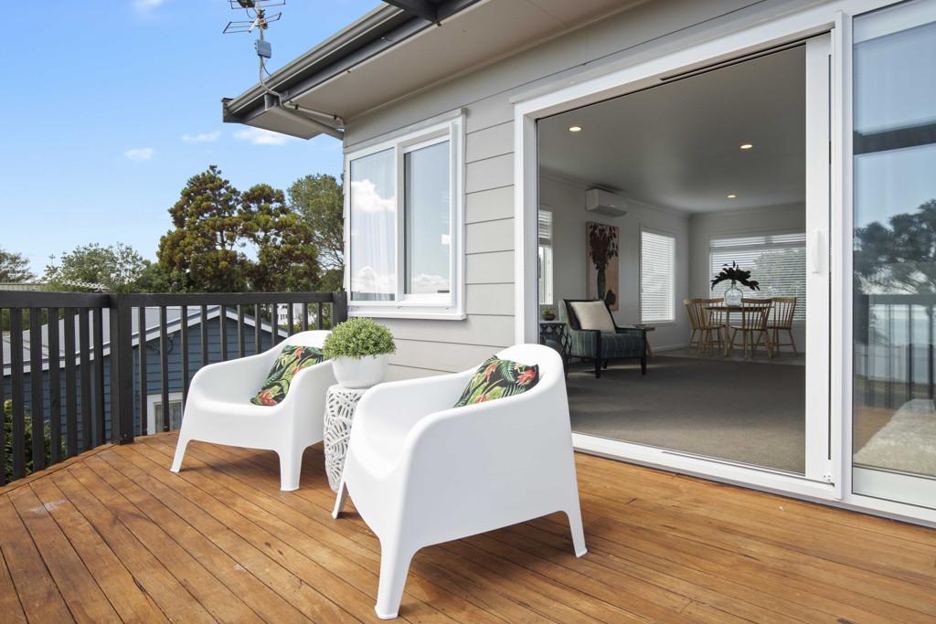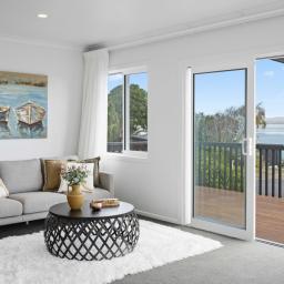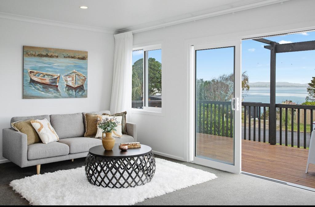 - Open-plan kitchen, dining, and lounge area with decking to enjoy stunning panoramic sea views of Clarks Beach