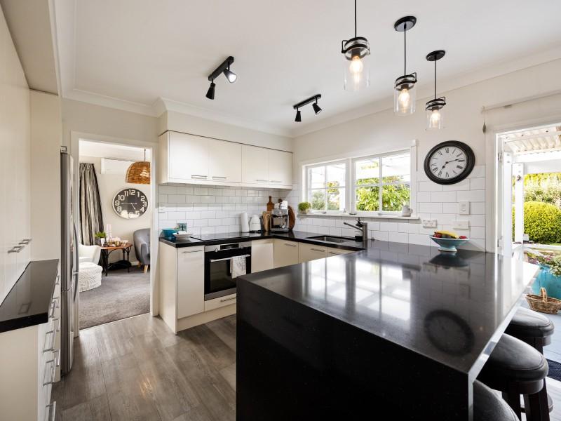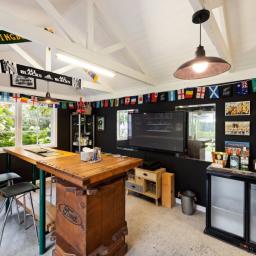 Updated kitchen featuring a tiled splashback, modern appliances including a dishwasher, and excellent storage. For those who appreciate space to pursue hobbies or entertain friends, the outdoor “man cave” offers a flexible area ready to be transformed to suit your needs, whether a workshop, studio, or relaxed hangout zone.
