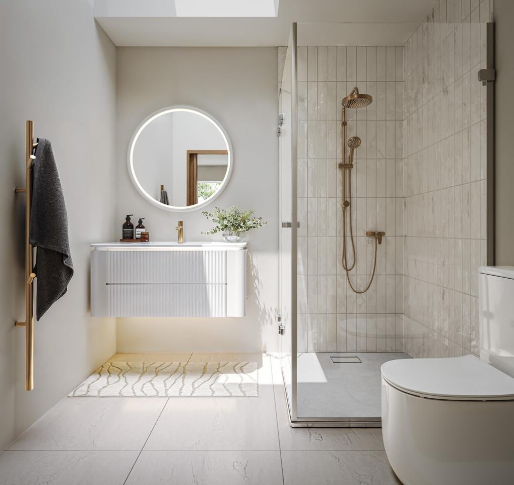 Interiors feature premium finishes throughout including Calacatta gold stone benchtops, brushed gold tapware, and hard-wearing laminate timber flooring. Kitchens are complete with designer cabinetry and warm brass detailing, while bathrooms include matte white vanities, brushed gold fittings, and modern shower slides with overhead rain heads.