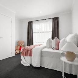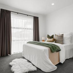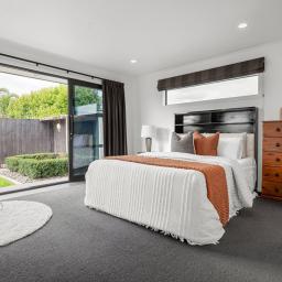 Four bedrooms sit within their own wing. The master suite includes a walk-in wardrobe, ensuite and direct outdoor access. A well-proportioned family bathroom and separate toilet support the remaining rooms. Double internal access garaging and a dedicated laundry complete a layout designed for ease.