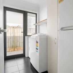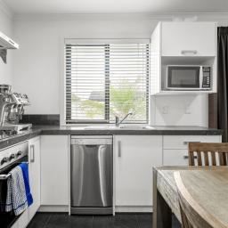 On the alternate frontage, the secondary residence presents as its own address. Two bedrooms. Open plan living. Full kitchen. Internal access garaging. A private courtyard enclosed from the main home.