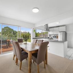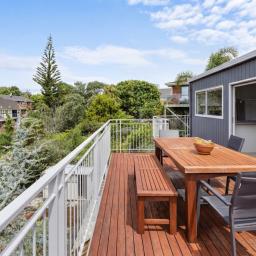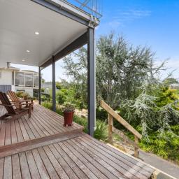 The kitchen and dining sit perfectly positioned to capture natural light and scenery, while the main living area opens wide to the deck, creating effortless indoor-outdoor connection.