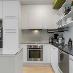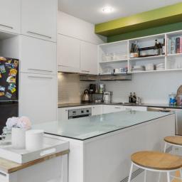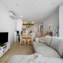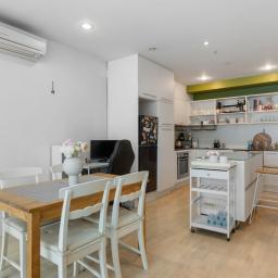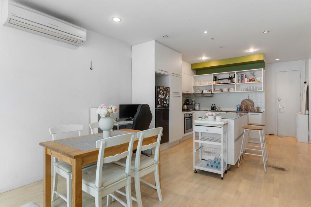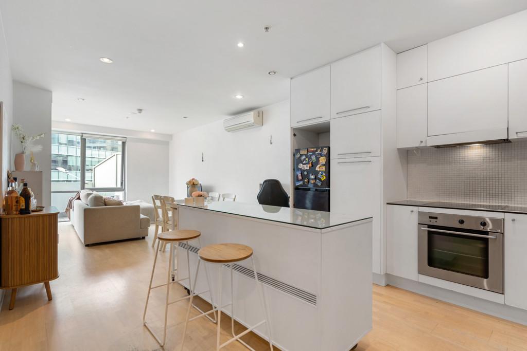 At the heart of the home is the open-plan kitchen, living, and dining area. The layout is both functional and inviting, centred around a fully equipped kitchen with a movable island bench that can be reconfigured for entertaining or everyday living. Large sliding doors extend the living space outdoors to a substantial balcony, perfect for alfresco dining, morning coffee, or unwinding with elevated city views.