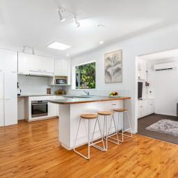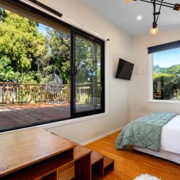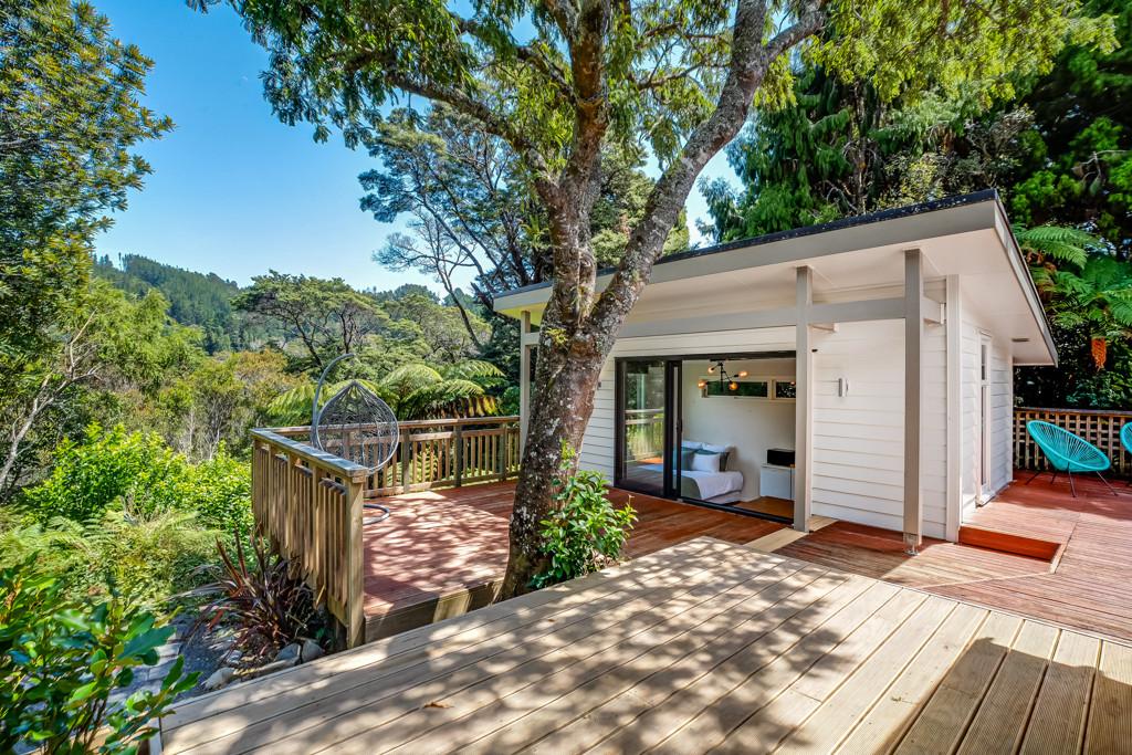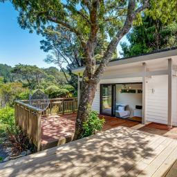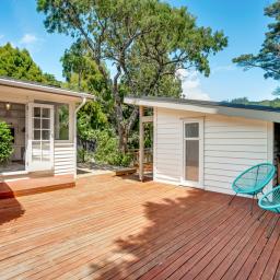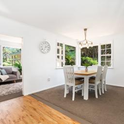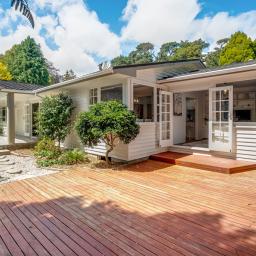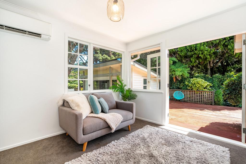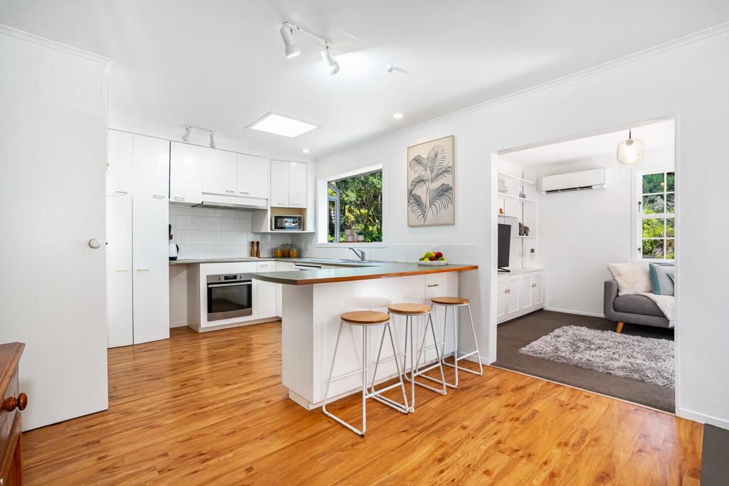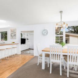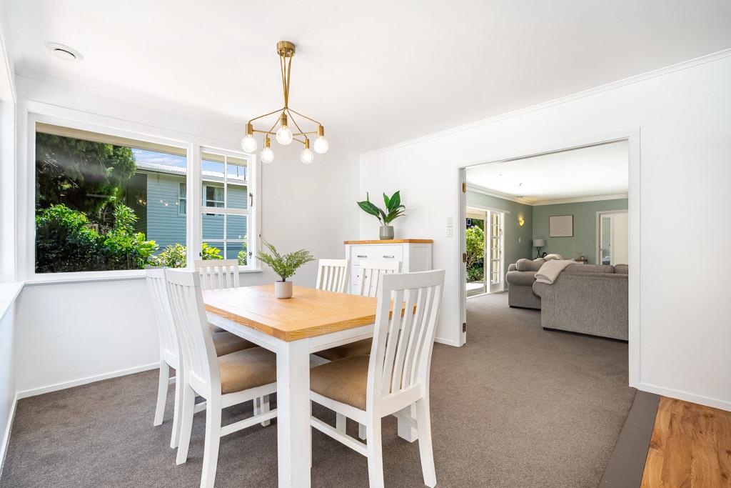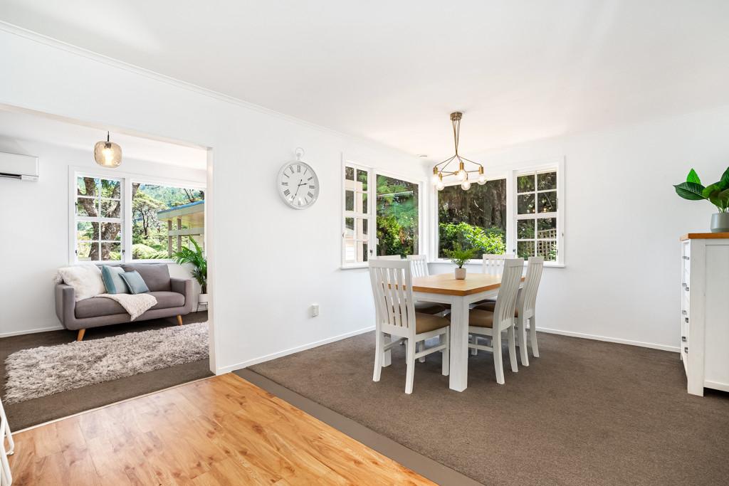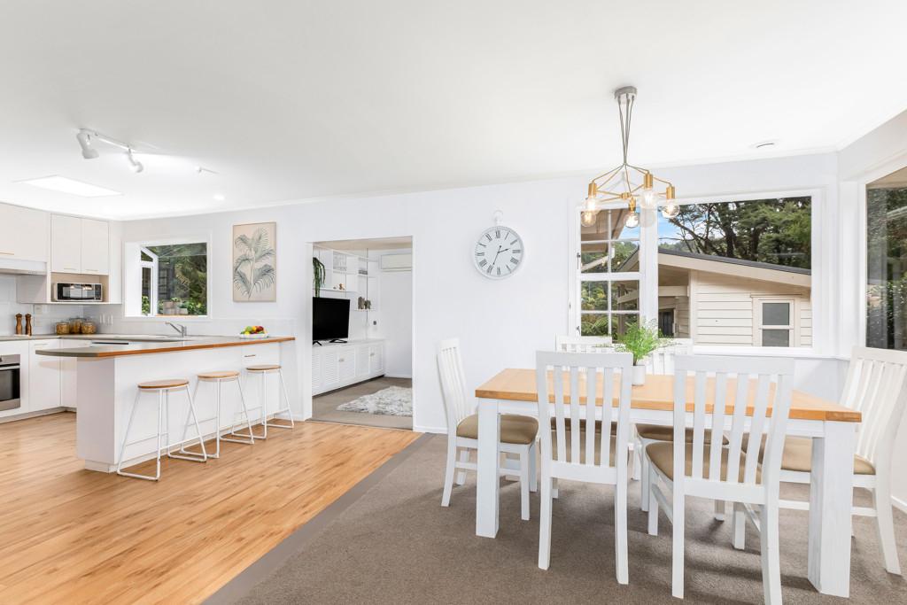 The open-plan kitchen and dining area form the heart of the home, offering practicality and connection for everyday living and entertaining. Nearby, doors open to an expansive deck, creating an ideal setting for hosting, dining outdoors, or simply enjoying the established bush outlook that defines this part of Pinehaven.