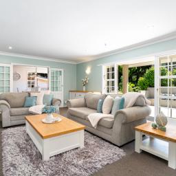 The main residence comprises four bedrooms and two bathrooms, with living spaces designed for everyday family life and larger gatherings. A spacious main lounge features a woodburner, creating a comfortable hub in cooler months, while a second living area offers flexibility as a media room, children's space, or retreat. These zones connect seamlessly to outdoor areas, enhancing the home's overall usability.