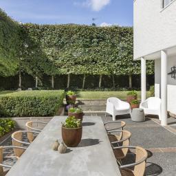 Constructed in solid concrete throughout, with white plastered interiors and exteriors, the architecture is confident yet restrained. Dark stained Douglas Fir ceilings and beams provide warmth and contrast, while stained oak floors and tiled areas define the home's living zones.