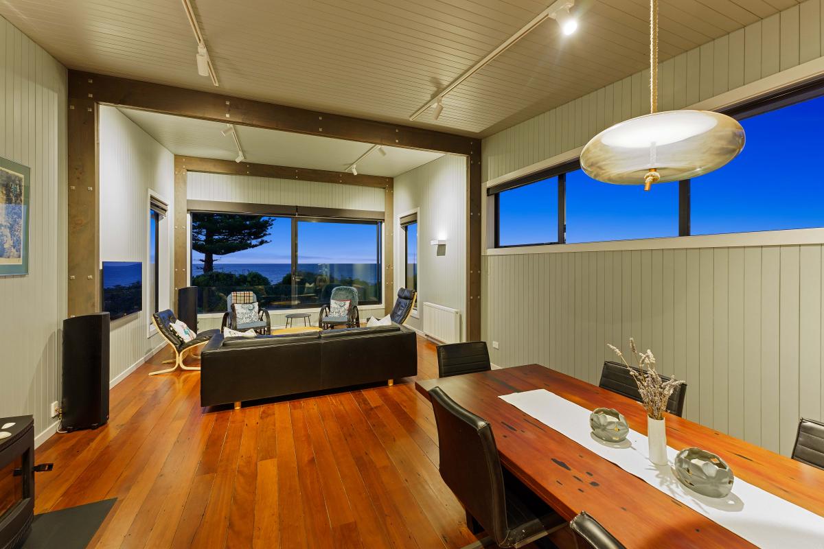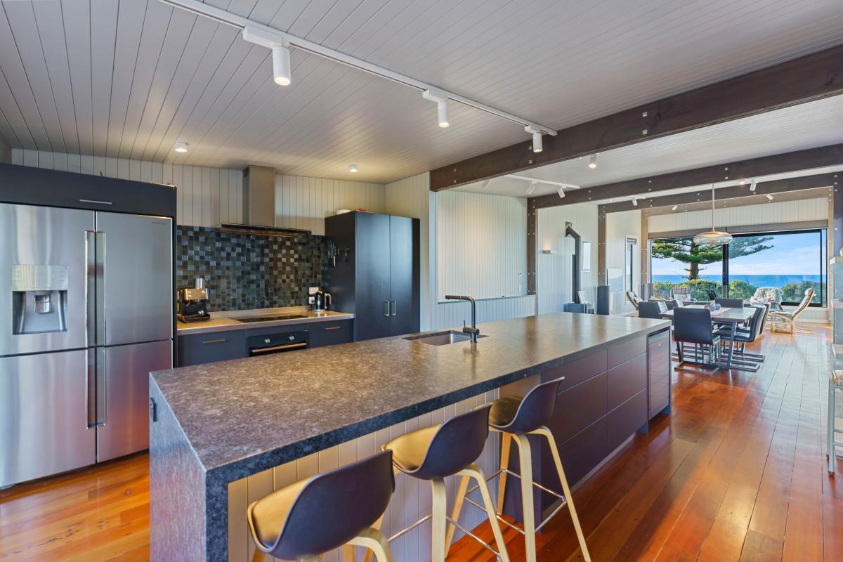Upstairs, the main living areas are nothing short of breathtaking. With a sophisticated industrial loft aesthetic, yet embracing a coastal feel the open-plan space is framed by sweeping sea views and flooded with natural light. This is a setting designed for elevated entertaining and quiet reflection alike – a place where morning coffee meets horizon sunrises and evenings unfold with the sound of the ocean below.