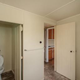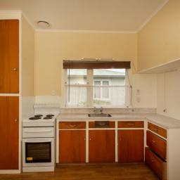 The separate kitchen provides plenty of timber cabinetry and drawers, with cooking via an electric stove. Cheerful lemon tones continue here, complemented by easy-care vinyl flooring.
