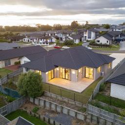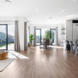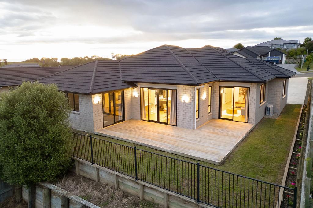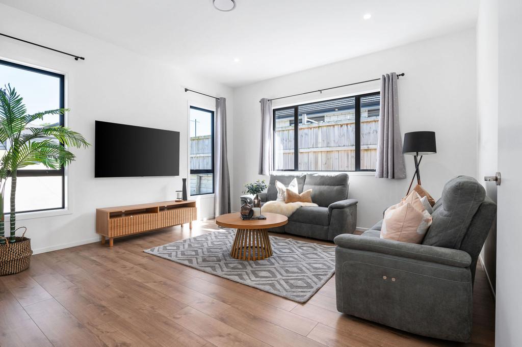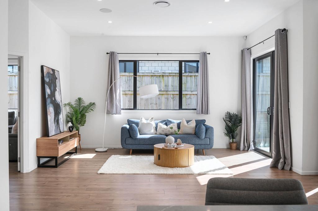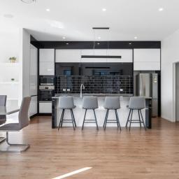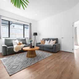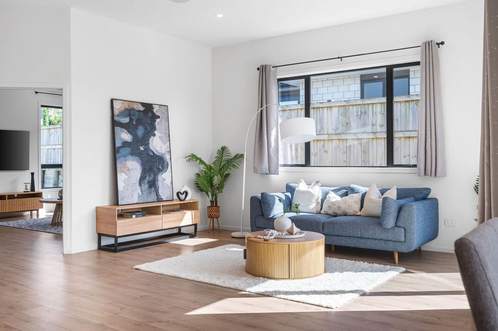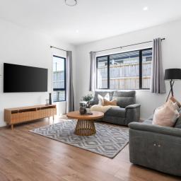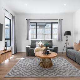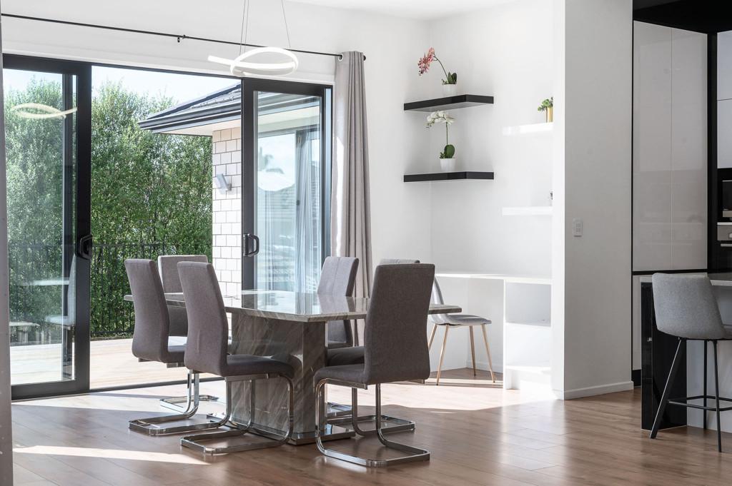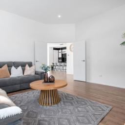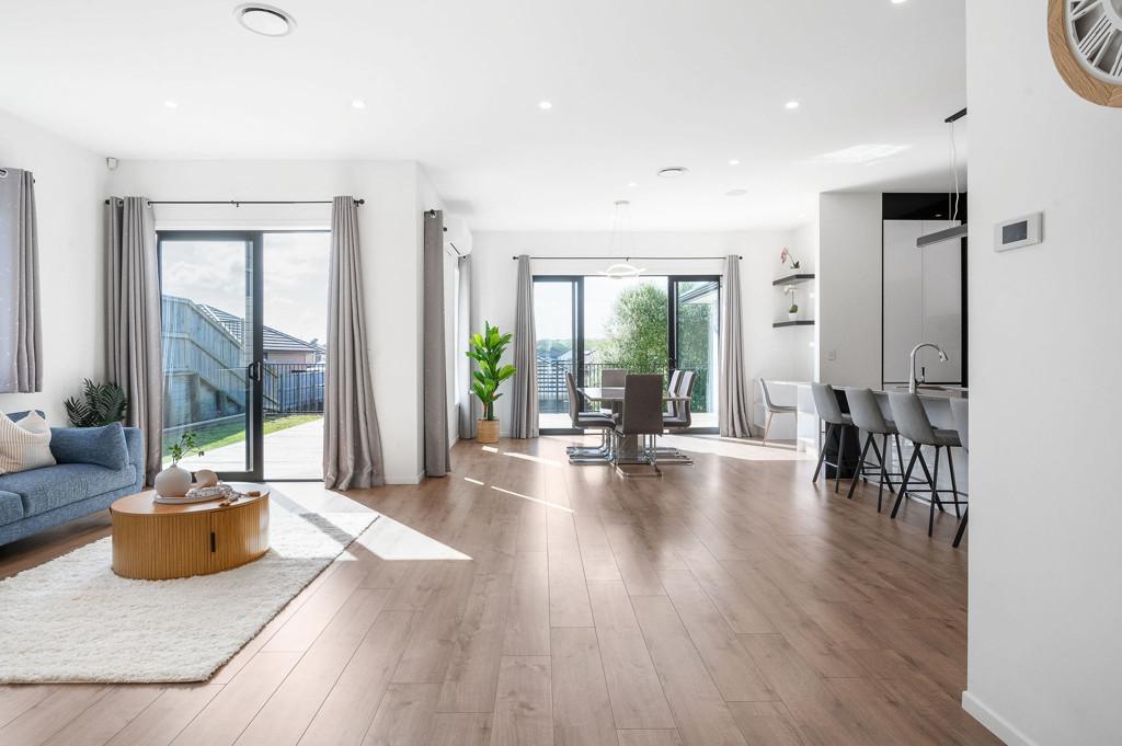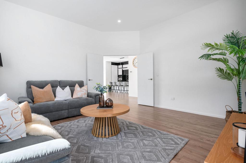 Inside, scale takes centre stage. High-stud ceilings through the main living zones immediately enhance the feeling of light and volume. The open-plan domain stretches wide and welcoming, anchored by a striking black-and-white kitchen that is both bold and beautifully practical. Stone benchtops, a generous island with breakfast seating, quality appliances and a scullery combine to create a space that works just as well on busy weekday mornings as it does when hosting friends. Large sliders extend the living outdoors to a substantial timber deck. Sun-soaked, it's a natural platform for entertaining while still offering room for children and pets to enjoy the fully fenced yard. A separate lounge provides valuable flexibility whether it's a retreat for movie nights, quiet reading or simply a second space for the family to spread out.