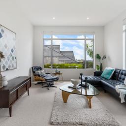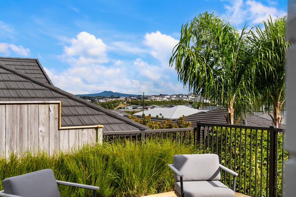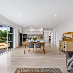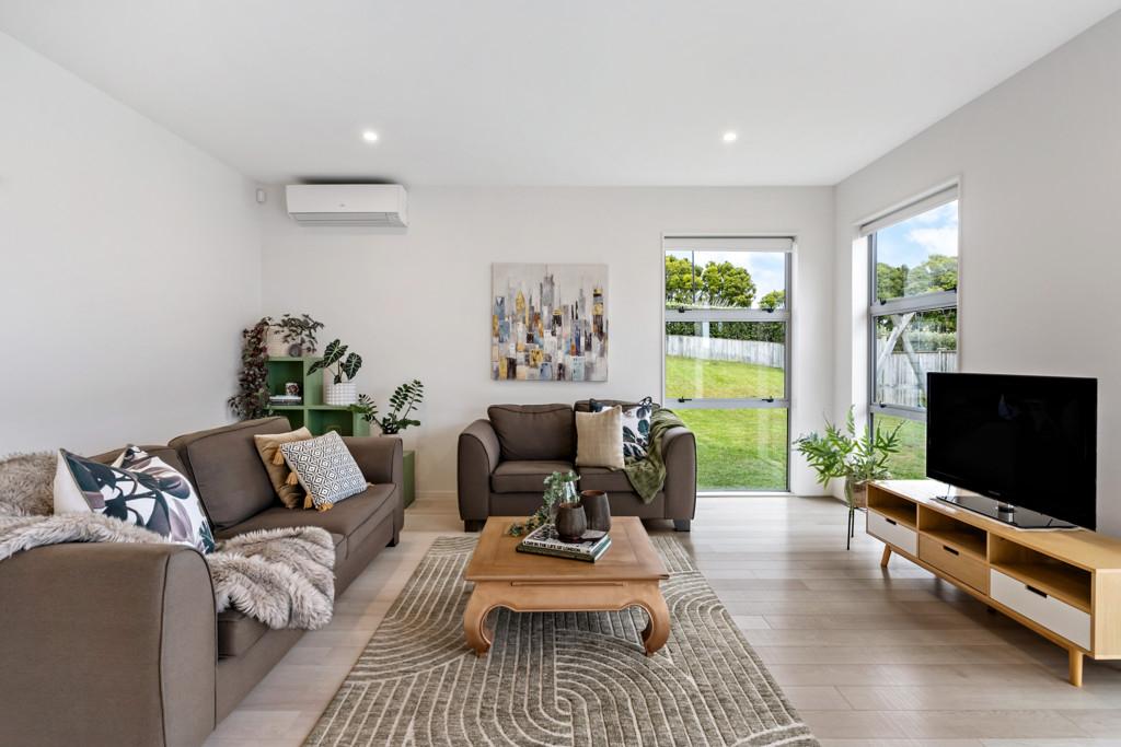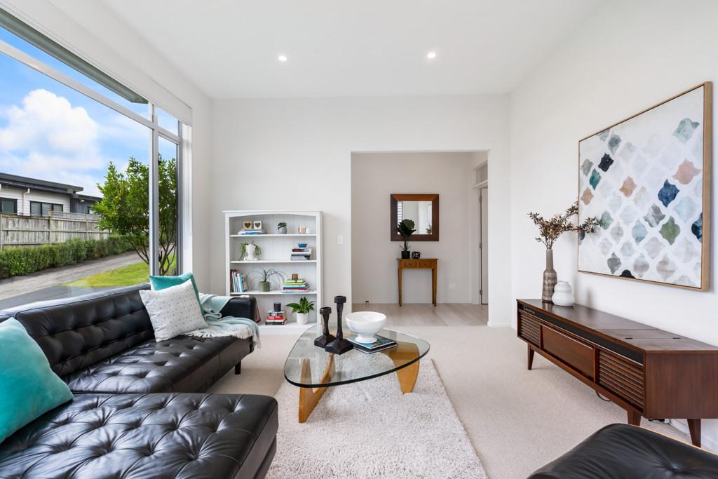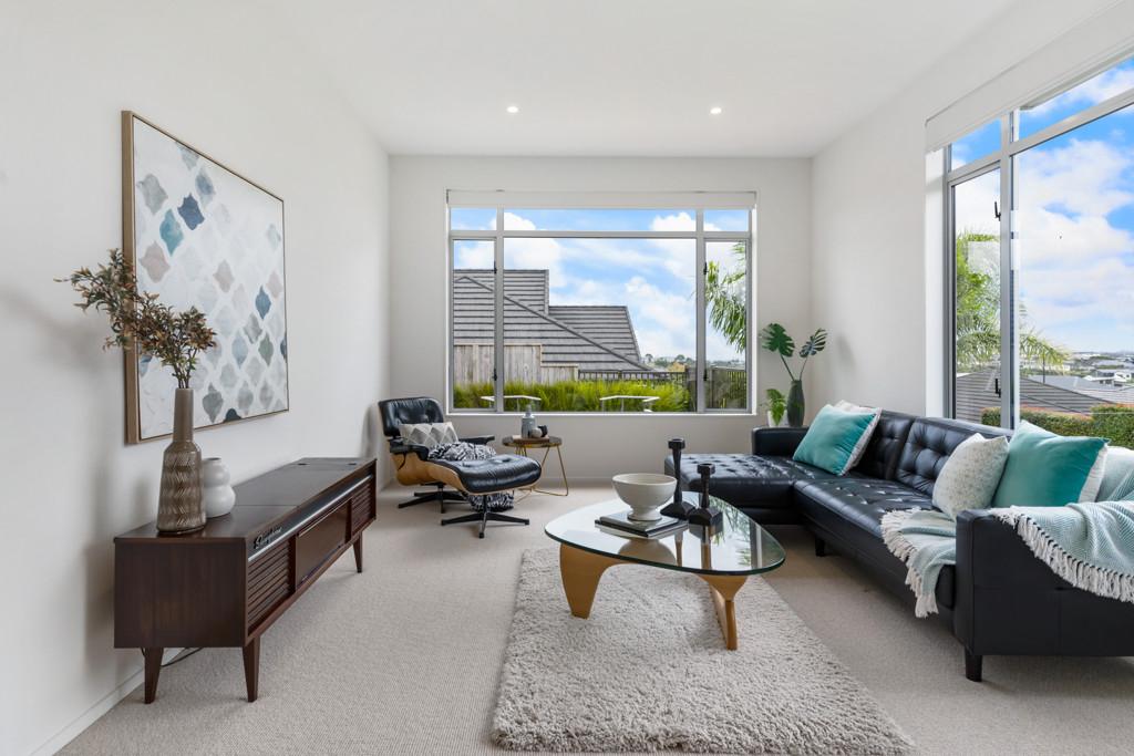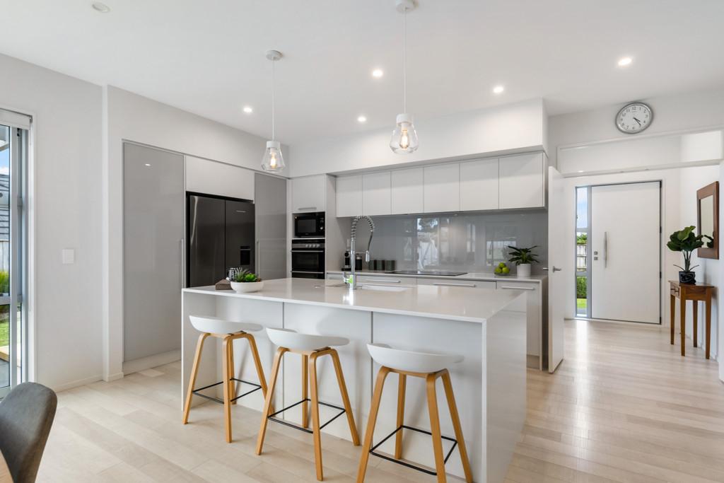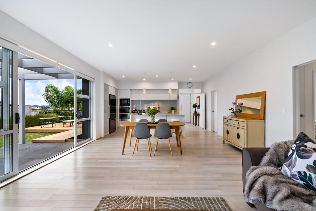Situated at the front of the home, a north-facing formal lounge is filled with natural light and captures sweeping views across the rolling hills of Beachlands, extending towards Rangitoto Island. Double doors create a seamless connection through to the heart of the home - a spacious open-plan kitchen, dining, and family living area designed for relaxed everyday living and effortless entertaining.