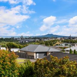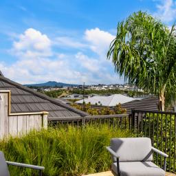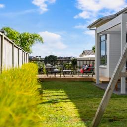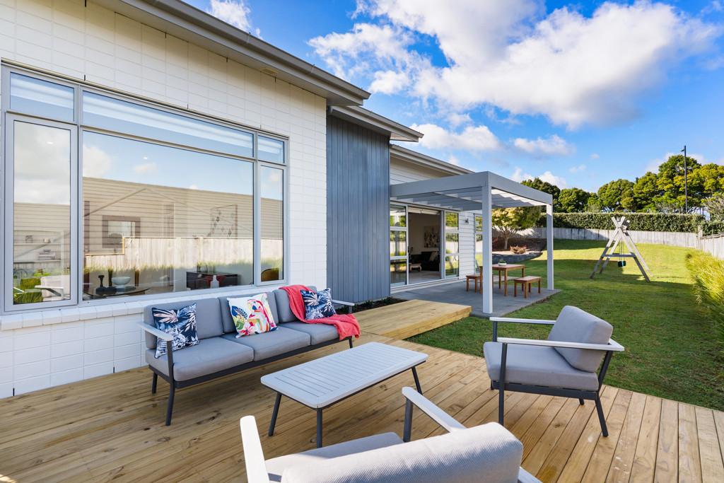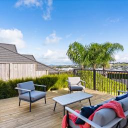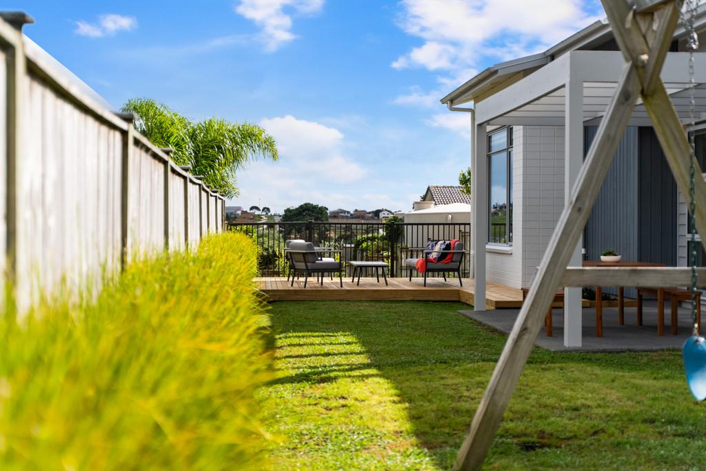 Ranch sliders open to a sun-soaked courtyard, a newly built deck, and a generous grassed backyard - a private outdoor haven that continues to capture elevated views of Rangitoto Island and distant sea vistas.