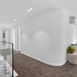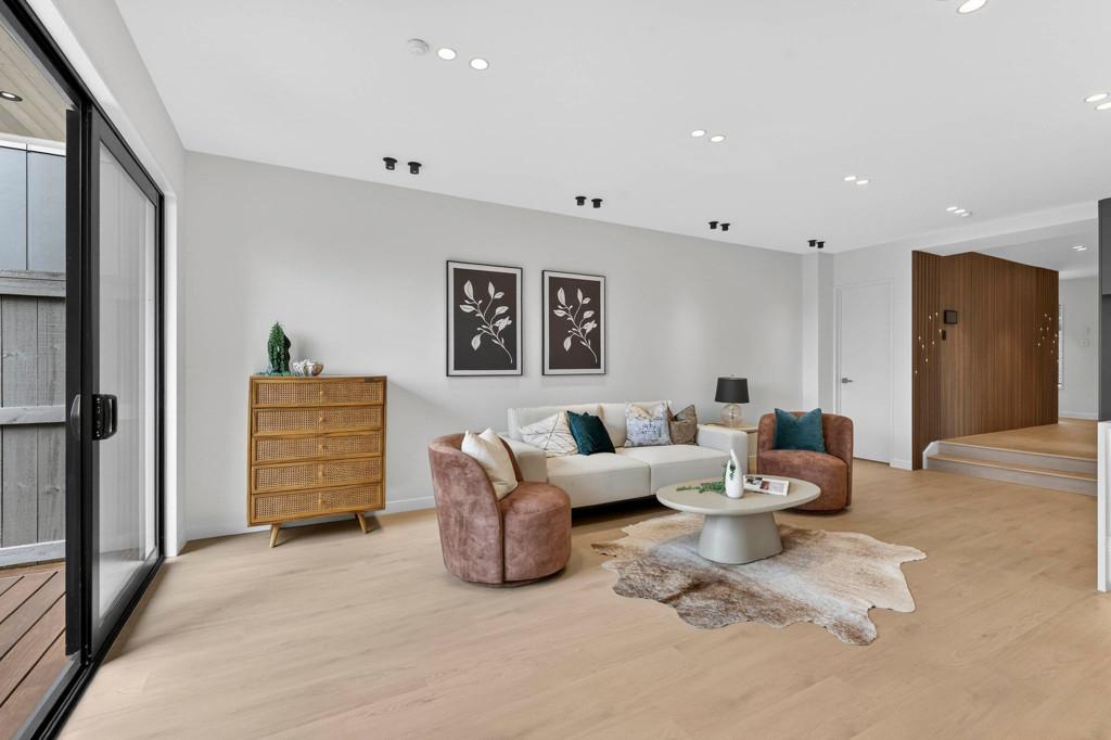 The heart of the home is the main living level, where an open-plan kitchen, dining, and living area flows effortlessly onto an expansive deck that wraps around the garden. Natural light fills the space, highlighting the carefully selected finishes and creating a seamless connection between indoor and outdoor living, perfect for entertaining, relaxing, or simply enjoying the afternoon sun. A feature wall along the corridor and a gently curved wall on the upper level add subtle architectural interest, giving the home a refined and considered feel.