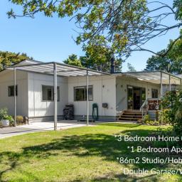 Offering a three-bedroom main home, a two-level self-contained studio apartment adjoining the separate double garage, and a semi connected substantial multipurpose studio/hobbies room building. The layout easily adapts to generational family living, teenagers, guest accommodation, working from home or simply generating additional income…maybe an AirBnB? And double glazing all round!!