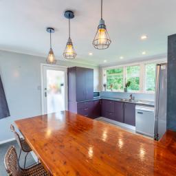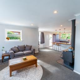 The home is ideal for family gatherings and entertaining with its updated kitchen and large living room, which is heated by a log burner. The kitchen features a stylish island, lots of storage, and is equipped with a dishwasher and stove. The living area is inviting, with plenty of natural light pouring in from the northerly aspect.