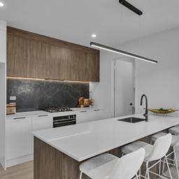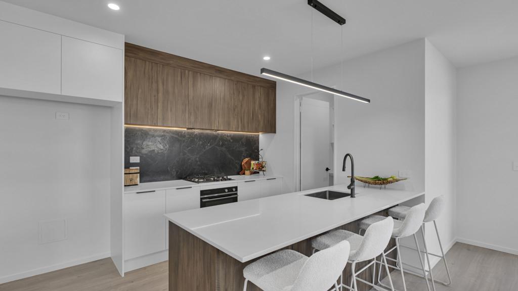 • Designer kitchen with gas cooking, engineered stone benchtop, and premium Fisher & Paykel appliances