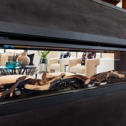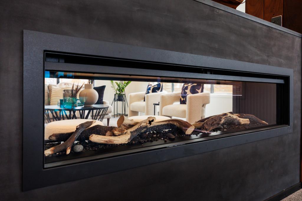 The open plan living area captures stunning views and is designed for both relaxed family living and entertaining. A double-sided gas fireplace framed by another stunning cedar feature wall creates warmth and ambience, seamlessly connecting the two living spaces.