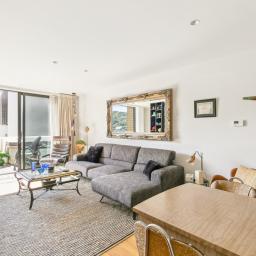 Bathed in natural light, the north-facing living area creates an inviting atmosphere, enhanced by engineered timber flooring that strikes the perfect balance between style and comfort. The open-plan design seamlessly connects a sleek, entertainer's kitchen-complete with premium appliances-to expansive living and dining zones that feel more akin to a freestanding home.