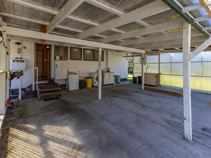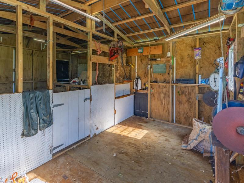The three bedroom one bathroom cottage sits on nearly three hectares of land over two titles. There’s a huge garage with it’s own carport and multiple utility sheds including the portable chook house, the woolshed, woodshed, garden shed and more. There are several small paddocks which are well fenced and with their own water supply.