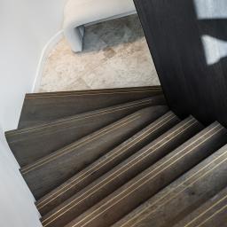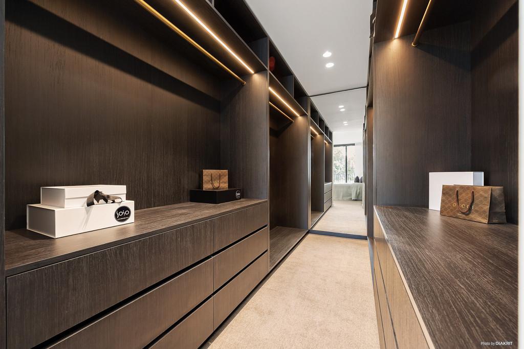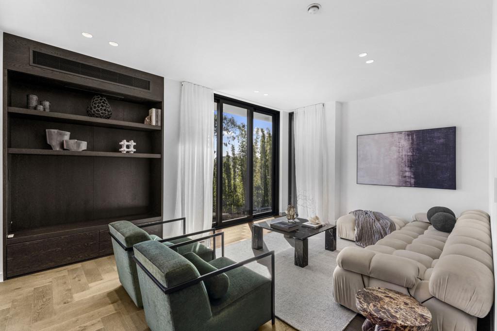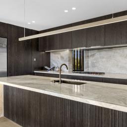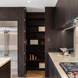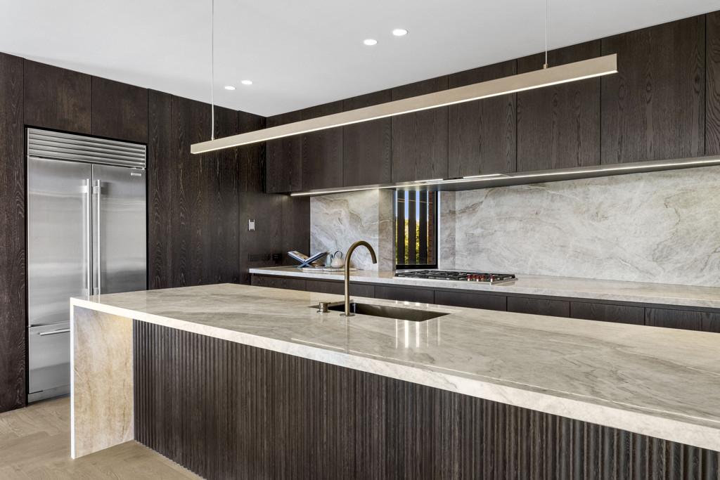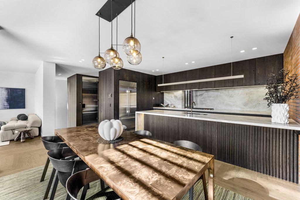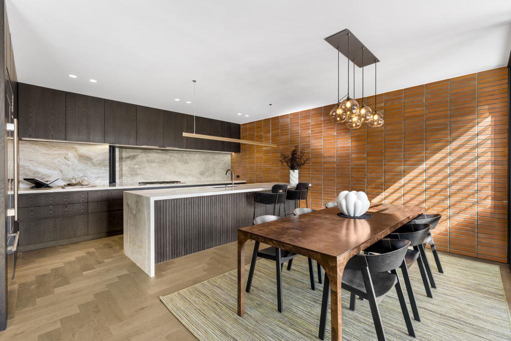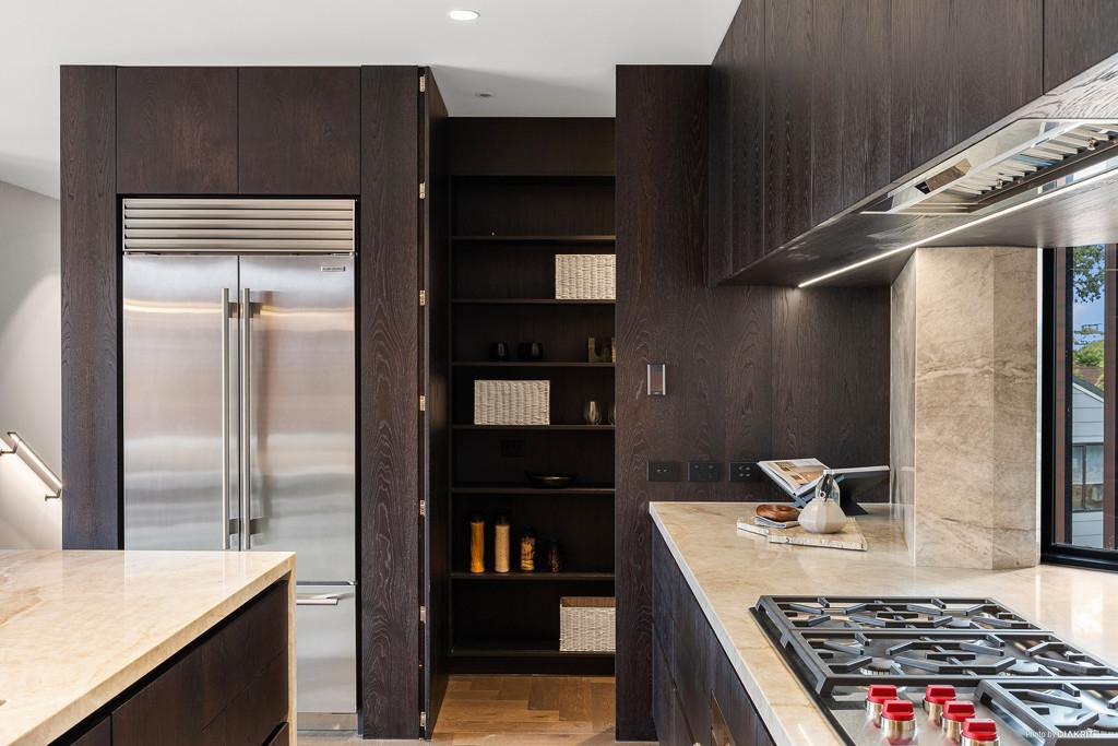 The top floor hosts the heart of the home: open-plan living, dining, and a gourmet kitchen with elevated views. Sliding glass doors open to a sheltered terrace, and the herringbone flooring brings warmth. The kitchen is a chef's dream - brick accents, dark cabinetry, granite finishes, Wolf appliances, Sub-Zero fridge, walk-in scullery, and generous storage.