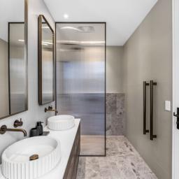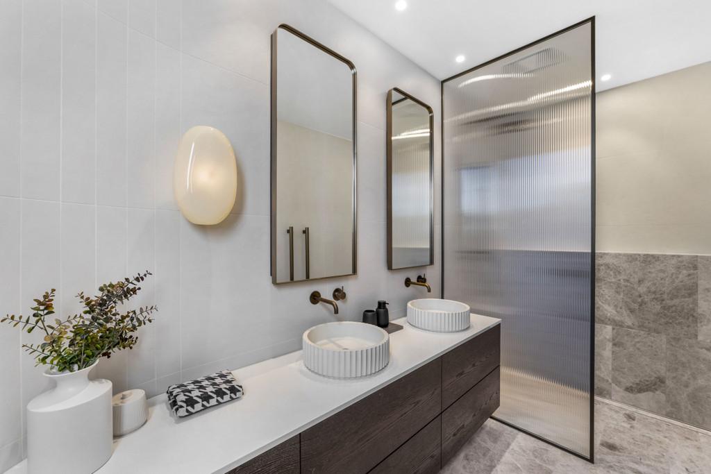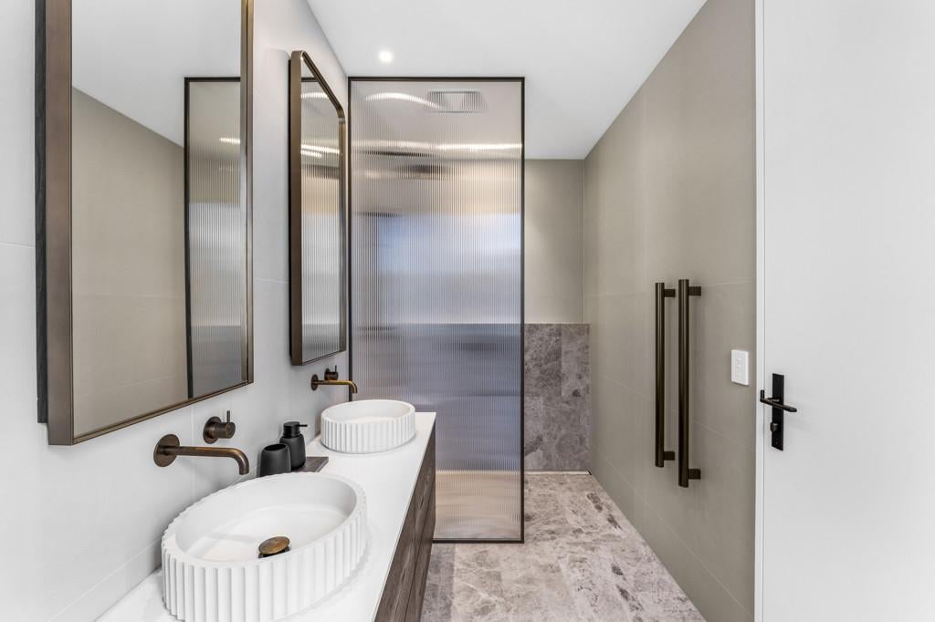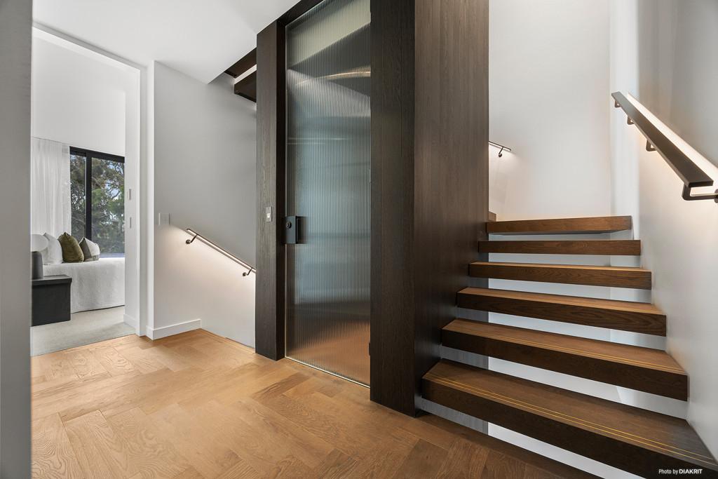 The central floor houses a luxurious master suite with walk-in wardrobe and elegant ensuite, plus two additional bedrooms and a family bathroom. Dark timber, reeded glass, and bright neutrals create calm and character throughout. Downstairs, find a double garage, fourth bedroom (2nd living/work from home) with ensuite bathroom, laundry, and ample storage. A lift and sweeping staircase link all three levels, making this home as practical as it is stylish.
