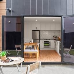 At the heart of the home, the light-filled open-plan living and dining area flows seamlessly through French doors to a west-facing courtyard — perfect for soaking up the afternoon sun while enjoying the outlook to the reserve beyond.