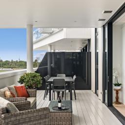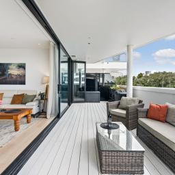 Large sliding doors extend the living environment outward to a substantial covered balcony that has become a true extension of the home. Generous in scale and protected from the elements, it functions as an additional living room throughout the year, ideal for entertaining or simply enjoying the outlook across Alexandra Park and the surrounding landscape.