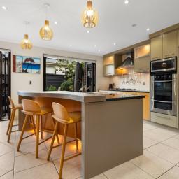 At the heart of the home, the kitchen is both functional and social in design. A well-executed parallel layout provides excellent workspace and flow, complemented by gas cooking for those who love to create and entertain with ease. Bifold doors open the space wide to an adjoining entertaining deck, creating a seamless connection between indoors and out ideal for alfresco dining, sunset drinks, or chatting to friends and family. Expansive open-plan living and dining areas sit alongside additional breakout spaces across the upper levels, offering flexibility for both connection and retreat. The cleverly designed layout allows families to spread out comfortably while still enjoying central gathering zones.