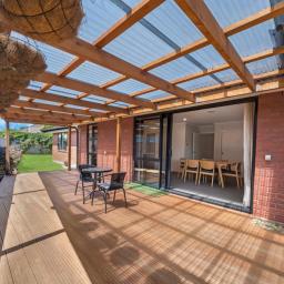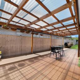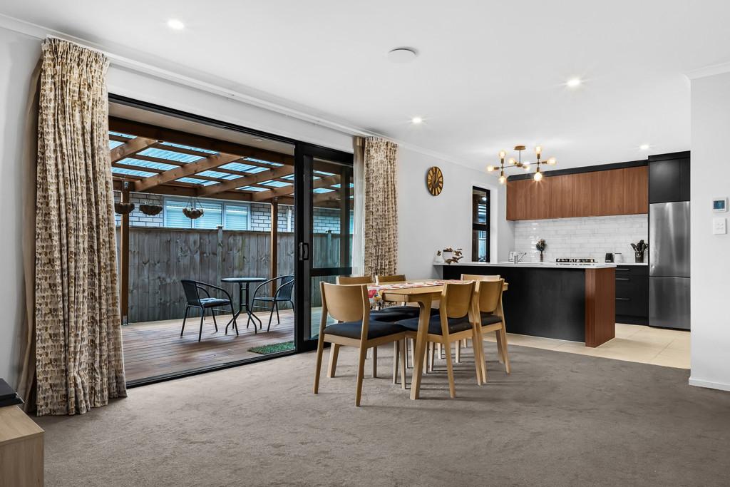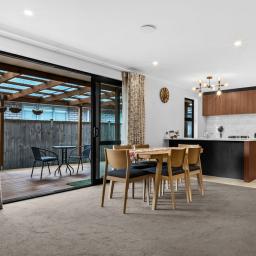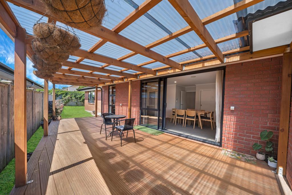 The modern open-plan kitchen is equipped with a Fisher & Paykel gas cooktop and quality appliances, flowing seamlessly into the spacious dining and living area. A separate formal lounge provides the perfect retreat for entertaining guests or enjoying quiet family time. Large sliding doors open out to a sun-soaked deck with pergola, ideal for BBQs, outdoor parties, or simply relaxing in the fresh air while enjoying all-day sun.